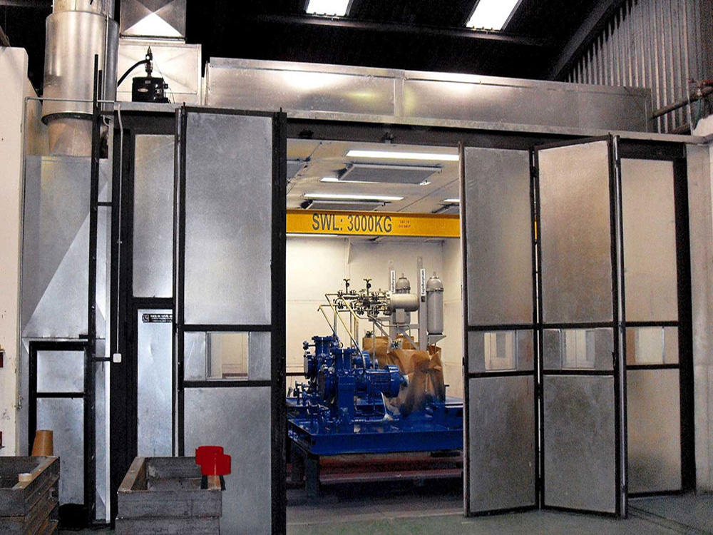 The final layout of the spraybooth paint plant can incorporate a rational design in which the spraybooth remains open faced for product entry and exit by means of trolley or overhead crane as a total enclosed structure would be impractical and hinder the movement of the paint operators and equipment to be sprayed.